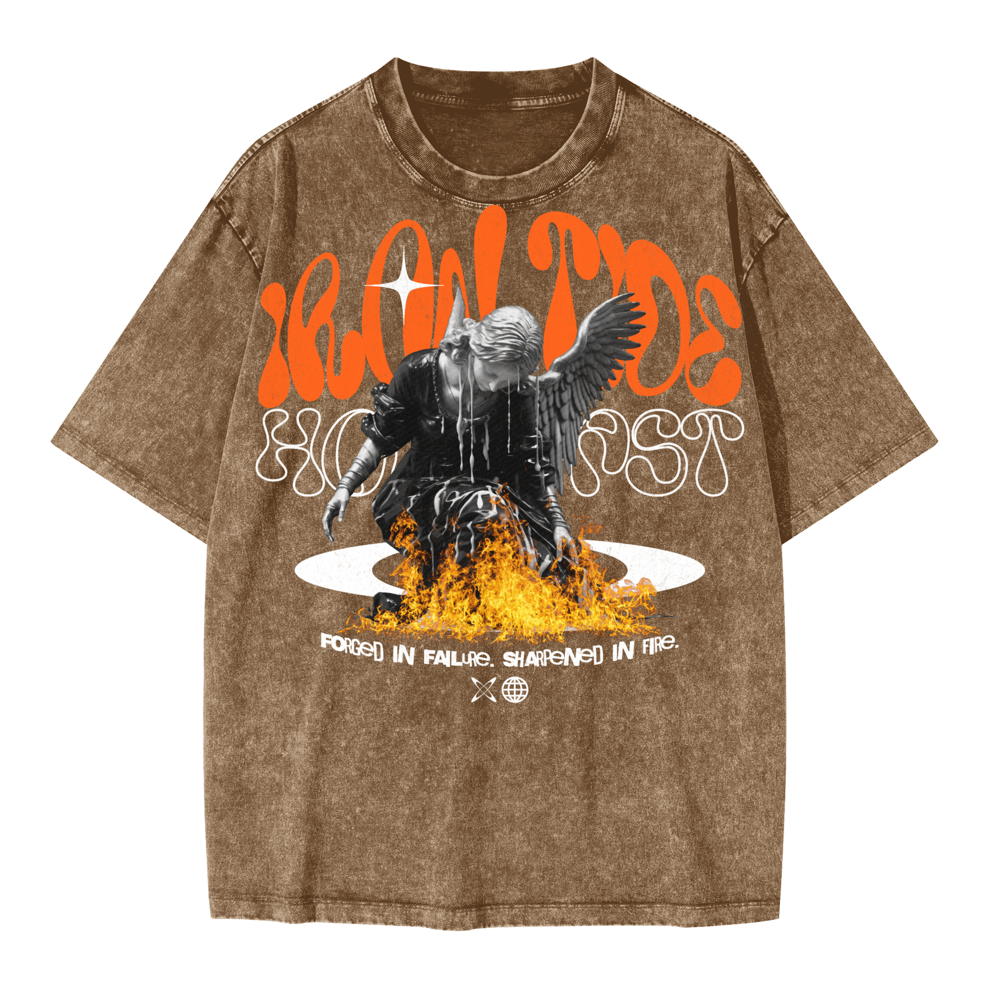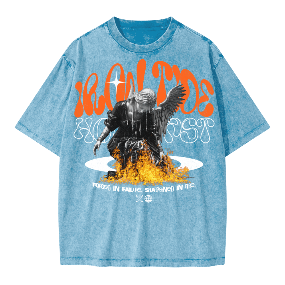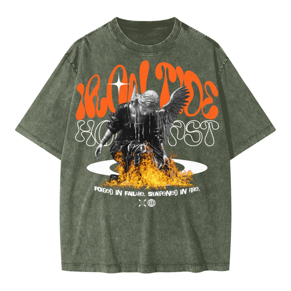 Summoned from the ashes, the Fallen Angel Tee embodies the heart of Iron Tide—resilience, grit, and the fire that shapes warriors. This oversized, snow-washed heavyweight shirt features a striking depiction of a kneeling angel rising through flame, symbolizing the truth every fighter knows: we are forged in failure and sharpened in fire.