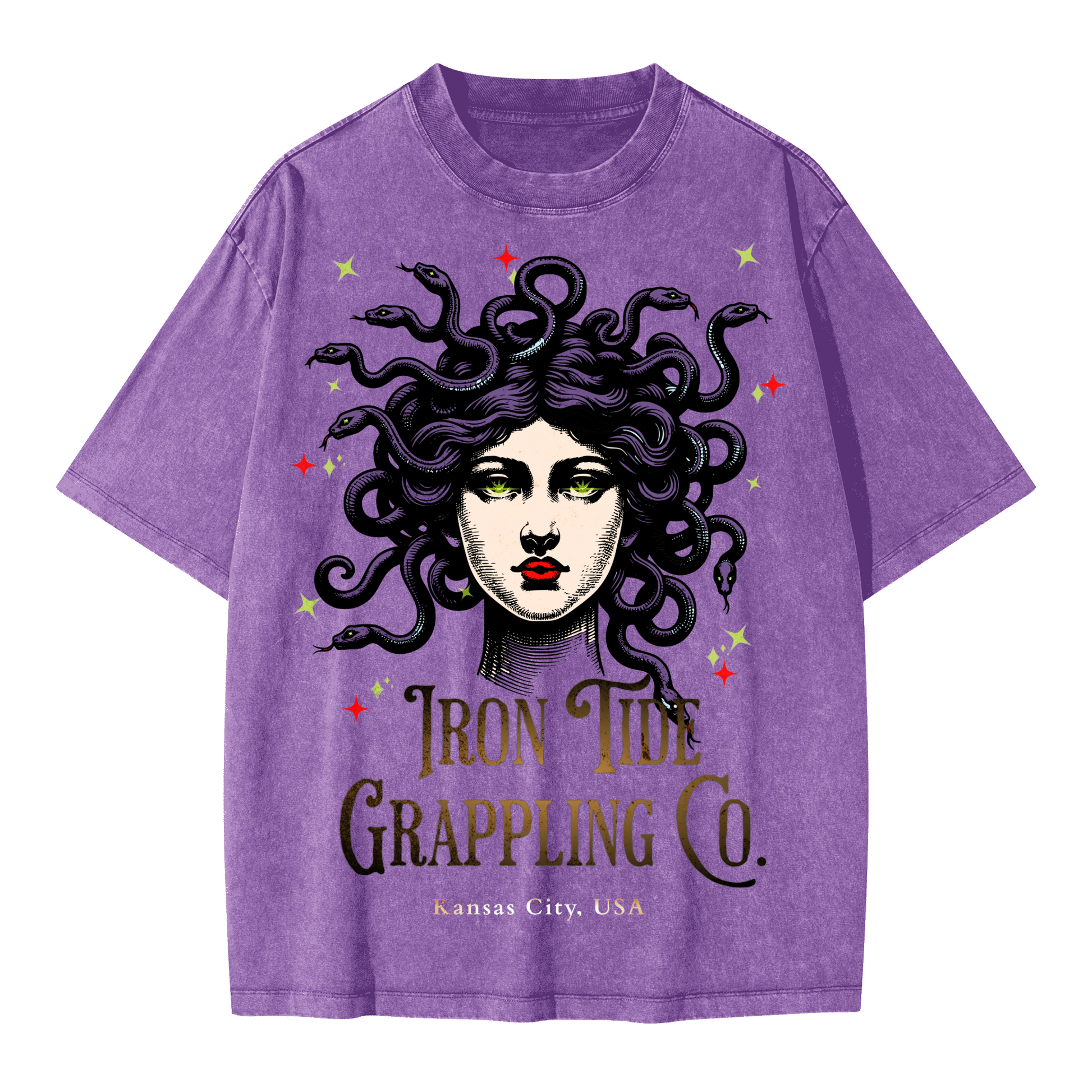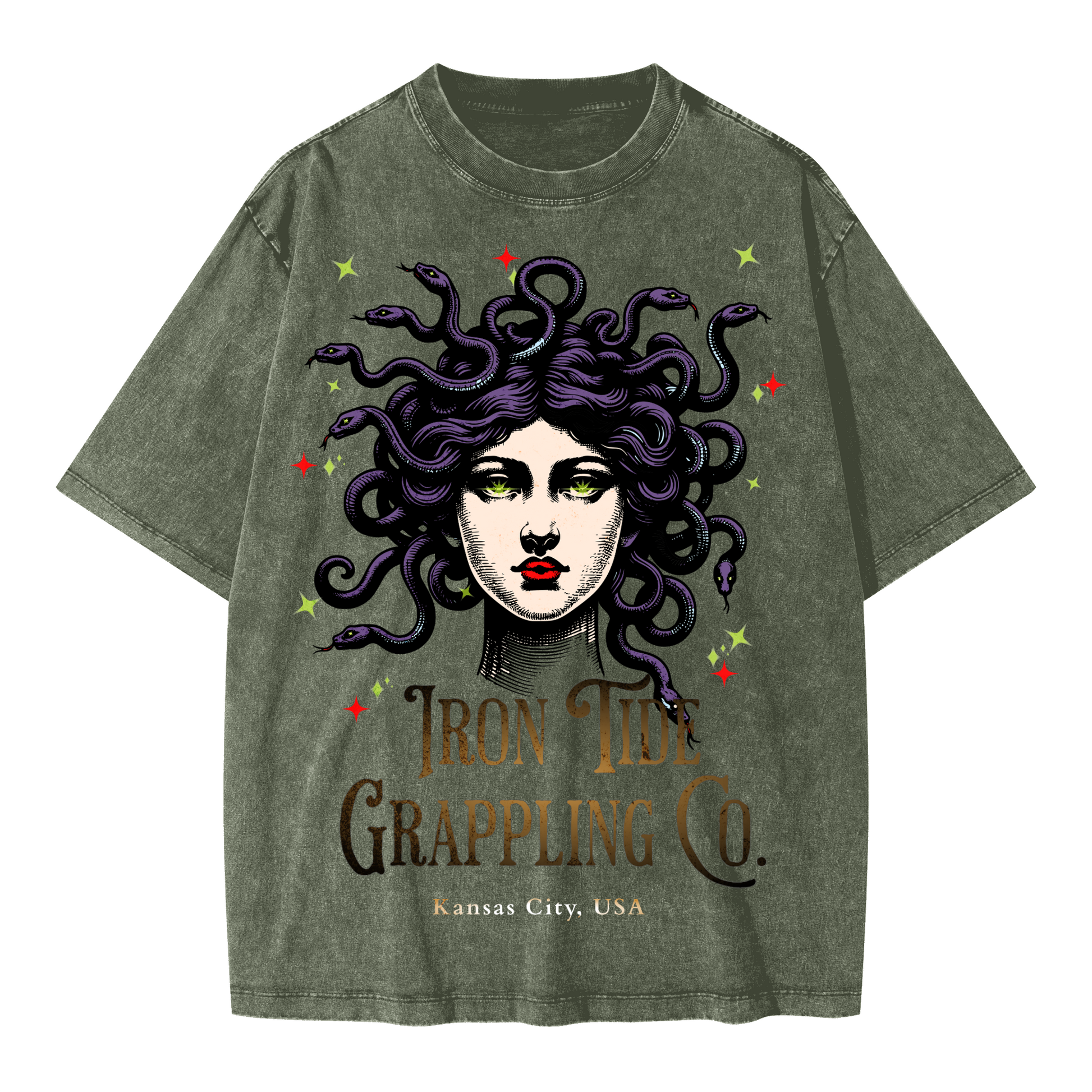 Each shirt features our bold Medusa centerpiece—framed with subtle star accents and distressed “Iron Tide Grappling Co.” lettering—designed to look and feel like a classic you’ve owned for years.